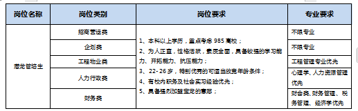 三、 岗位设置 本次“潜龙计划”面向五大类专业应届生,经培养后输出至各专业条线的核心岗位。专业类别及输出岗位对应如下:
